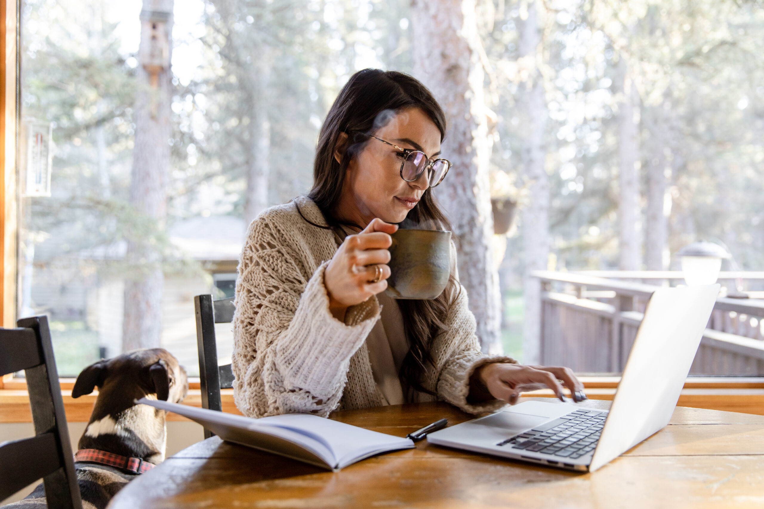 A woman wearing glasses and a cozy sweater sits at a wooden table, holding a mug and working on her laptop. As she reads about Terra Kaffe switching from Zendesk, her dog sits beside her by the window with trees visible outside.