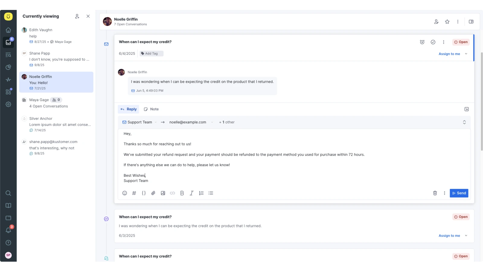 Build powerful automation rules based on Shopify data to keep conversations flowing, like initiating a conversation and instantly sending a promo code when your most high-value customers give a low CSAT score.