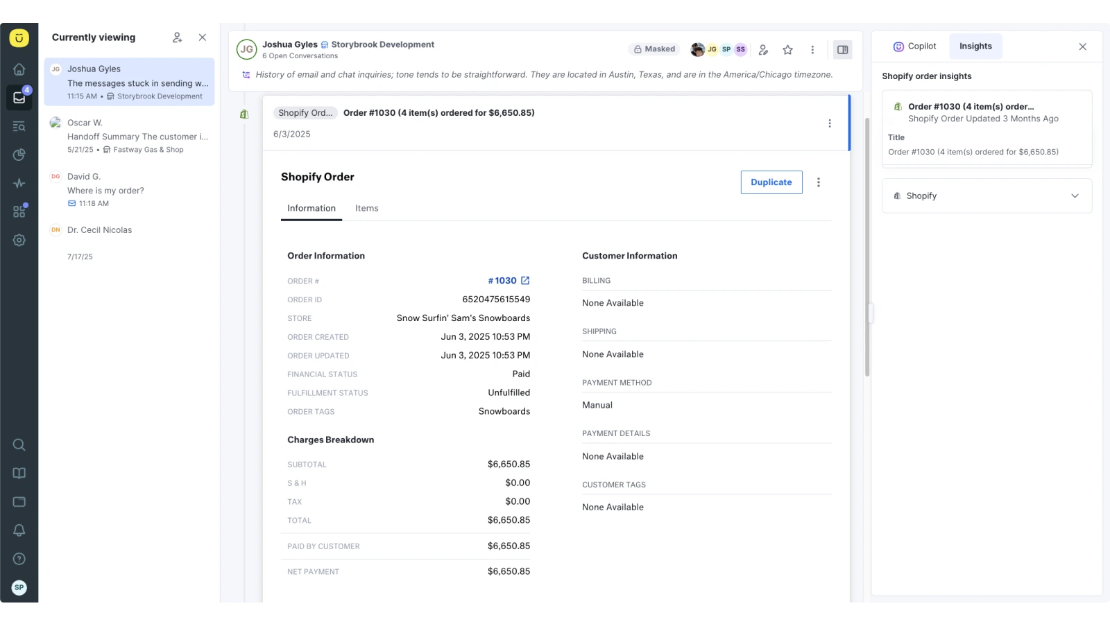 A chronological timeline view tracks and manages past and present interactions and Shopify orders all in one actionable agent workspace.