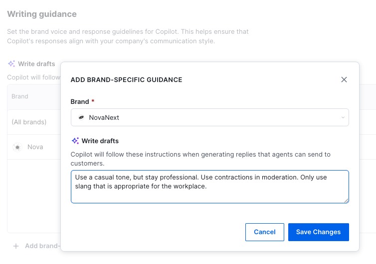 Without brand awareness, AI Agents for Reps could only rely on a single set of writing guidance and shared knowledge sources. That creates problems when different brands within the same org have distinct styles and policies. For example, one brand may need a formal, professional voice while another speaks in a casual and approachable tone. Return policies or escalation rules may differ as well, making it easy for conflicting or incorrect information to slip through.