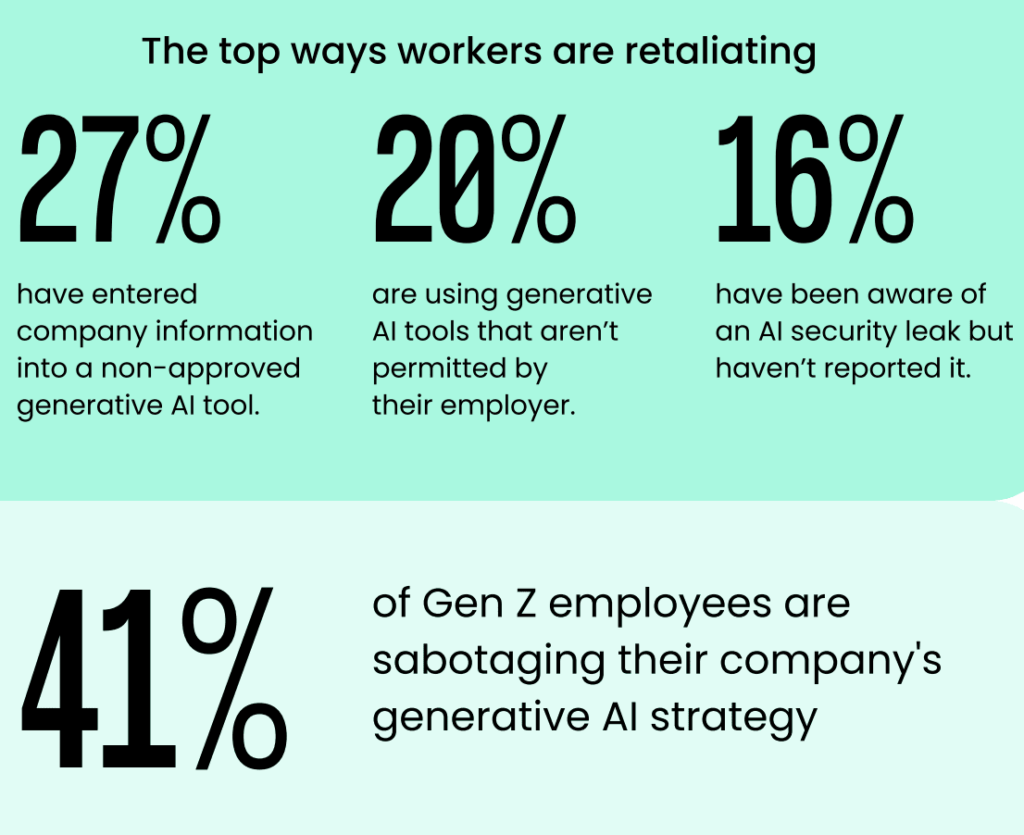 So it comes as no surprise when reports show that 41% of Gen Z and Millennial employees admit to ‘sabotaging’ their company’s AI adoption strategy. And 1 in 10 workers say they’re tampering with performance metrics to make it appear AI is underperforming [*].