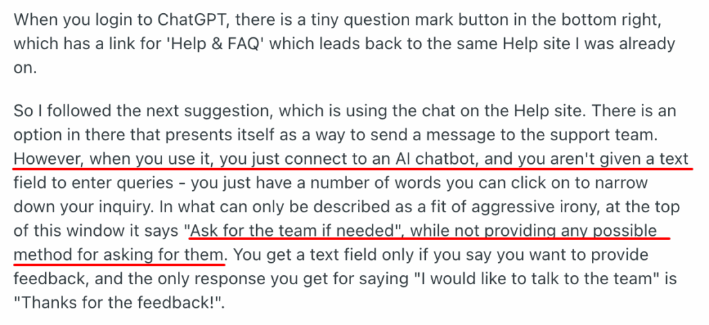 Another example is this OpenAI customer stuck in a ‘chatbot hell’ with no possibility of reaching a live support agent [*].