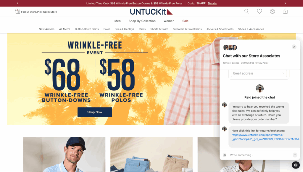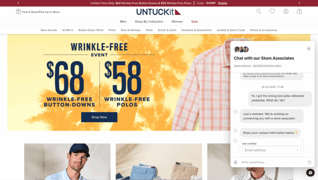 Here’s the famous menswear brand, UntuckIT integrating live human agents + AI in their customer service.