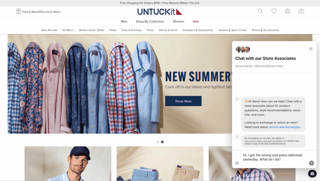 Imagine a customer named Tim opens a live chat on UNTUCKit’s website and types: