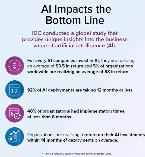 - For every $1 invested in AI, businesses are seeing an average return of $3.5, with 5% realizing up to $8 in return [*].