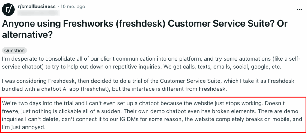 - Poor performance and buggy integrations. Users report that the platform becomes slow, with frustrating loading times, especially when handling high ticket volumes. This performance lag, combined with glitches and integration issues, directly disrupts agent workflow and hinders productivity.
