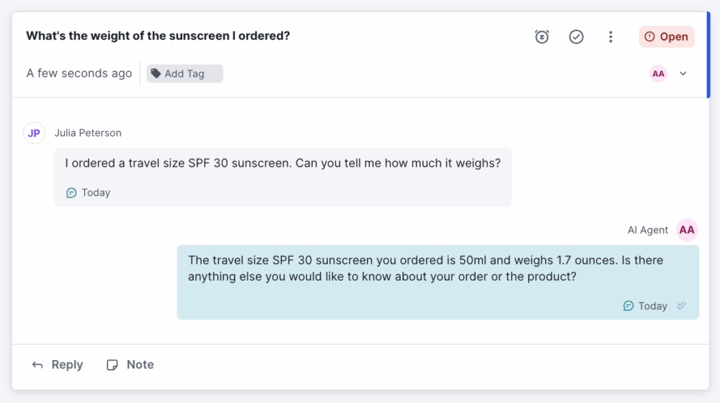 The AI Agent is then able to answer many common customer queries right away, such as verifying order details or providing product-specific information. However, if the customer needs a resolution that requires action—like initiating a return or changing an order—the AI Agent performs a seamless handoff to a human agent.