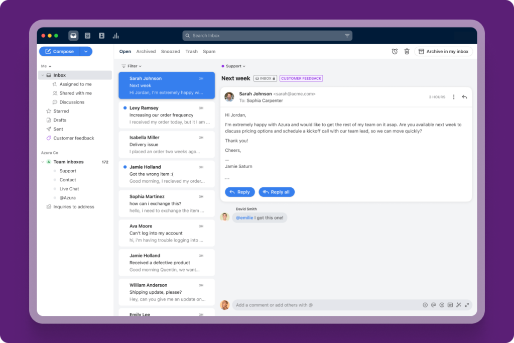- Shared Inboxes. Multiple team members can access and manage messages coming into a central inbox (e.g., support@, sales@, info@). Conversations are assigned, replied to, or discussed using internal comments.