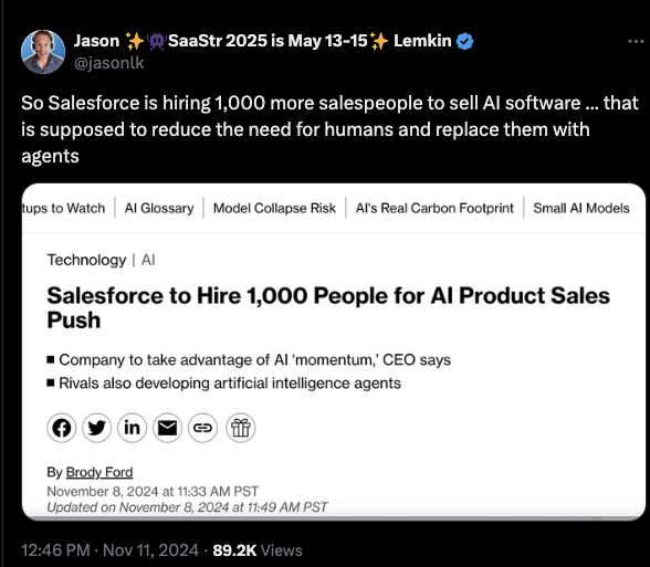 These organizations are hiring their own teams to develop, market, and sell their tools. Jason Lemkin posted on X about Salesforce's plan to hire 1,000 people to sell AI products. Lemkin points out the irony: AI could eventually replace those sales roles.
